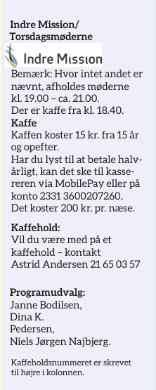 Mødested og tid: Missionshuset Bethel, Nørregade 22, Bjerringbro kl. 19.00 når ikke andet er oplyst: Se ½-årsprogrammet her.
